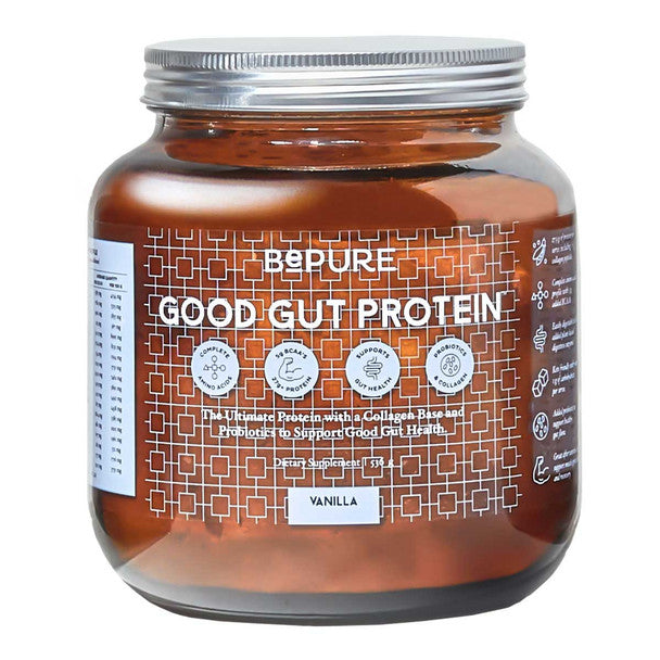 BePure Good Gut Protein - Vanilla is the ultimate gut loving protein, collagen and probiotic blend with full BCAAs (branched chain amino acids) and over 27g protein per serve.